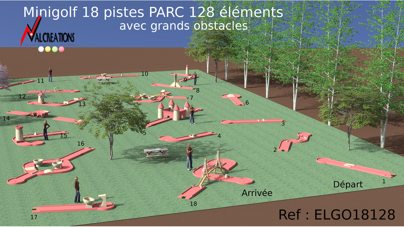 Sur un terrain de 27m par 18.50m soit 500m², nous vous présentons le mini golf 18 pistes PARC Version Courte.